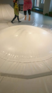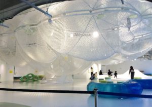 天井のミラーによって、まるで雲の中で遊んでいるような不思議な感覚で遊べる巨大ネット遊具。天井から吊るしたデコボコしたネットの中で全身を使って自由に動き回ることができます。